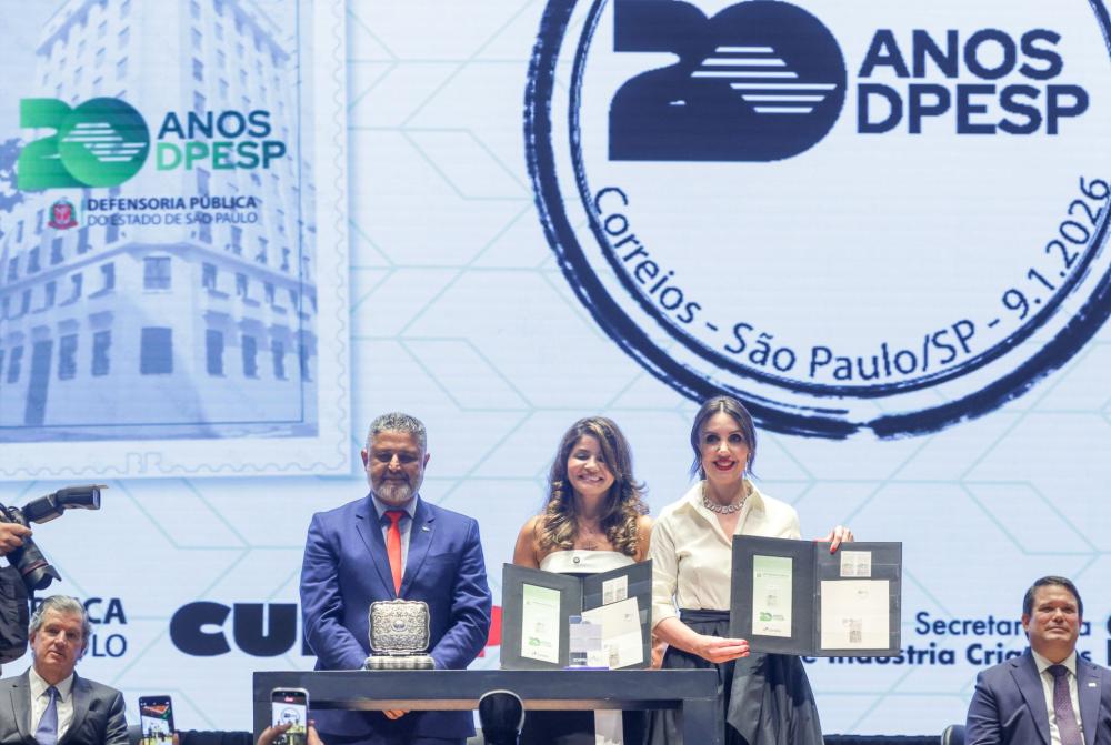 20 anos Correios e Defensoria lançam selo postal e carimbo comemorativos aos 20 anos da instituição paulista Lançamento foi realizado no dia 28/1, durante evento em celebração às duas décadas da Defensoria Pública de SP, na Sala São Paulo 06/02/2026 às 11h20